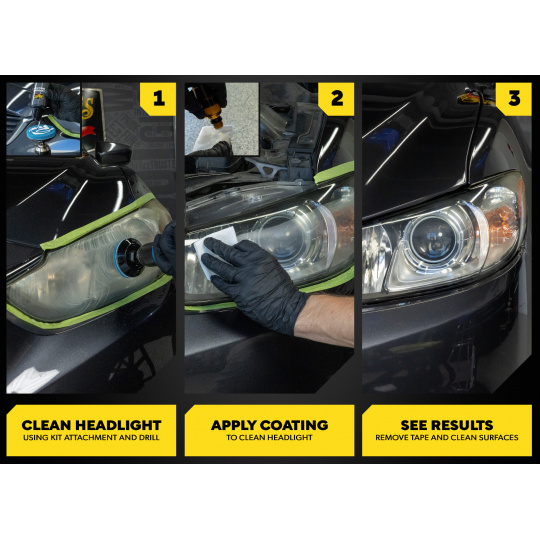 Sada kombinuje čisticí roztok, speciální brusné polštářky a keramickou ochranu s UV blokátory. Součástí balení je 3" unašeč na běžnou vrtačku.