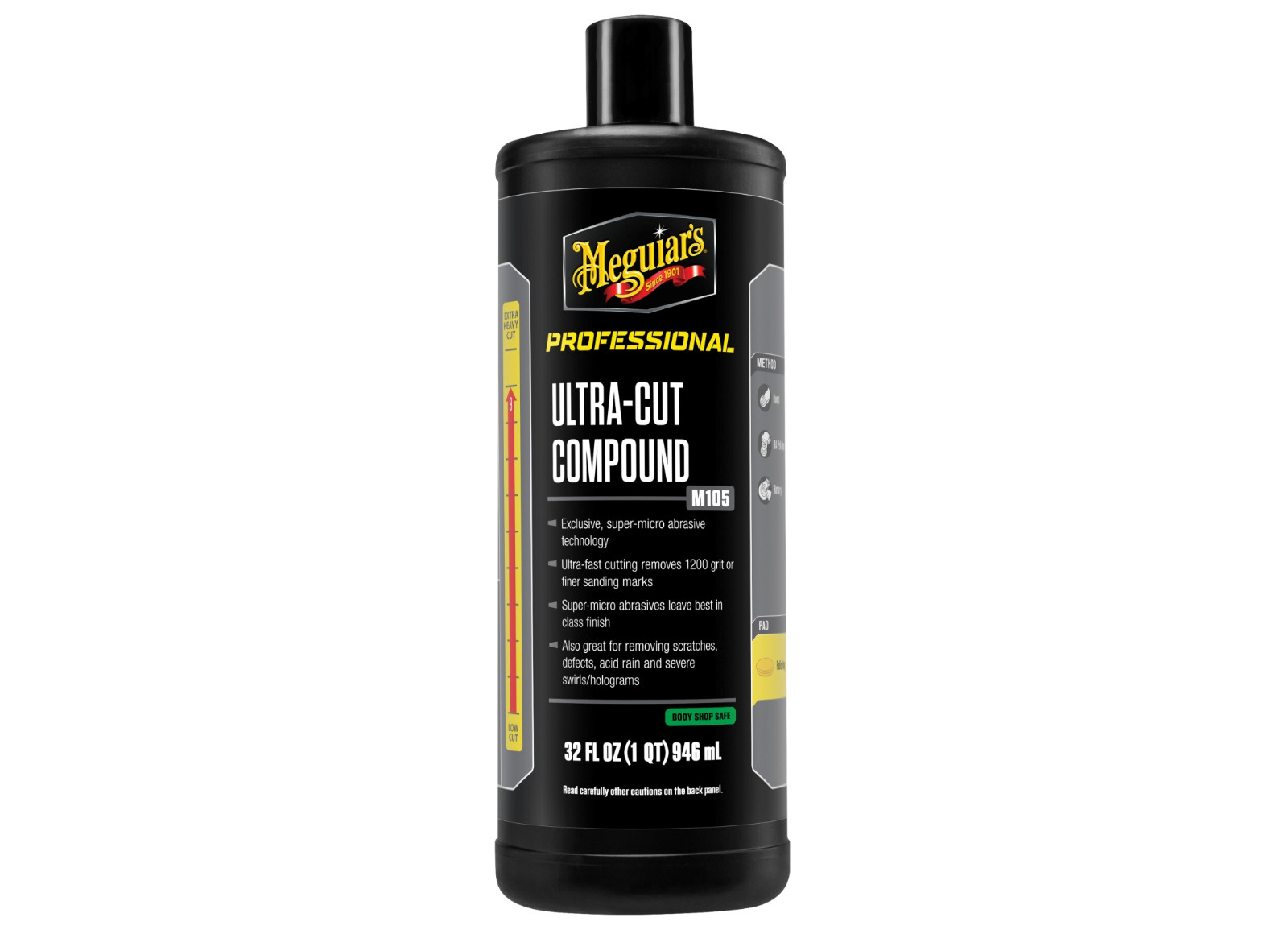 M105 Meguiar's Ultra-Cut Compound je prvním, korekčním krokem v profesionálním dvoukrokovém systému Meguiar's Mirror Glaze. S touto pastou, kterou můžete aplikovat jak ručně, tak strojně pomocí orbitální i rotační leštičky, odstraníte defekty laku (škrábance, skvrny, oxidaci, naleptání) i výbrusy až do zrnitosti 1200.