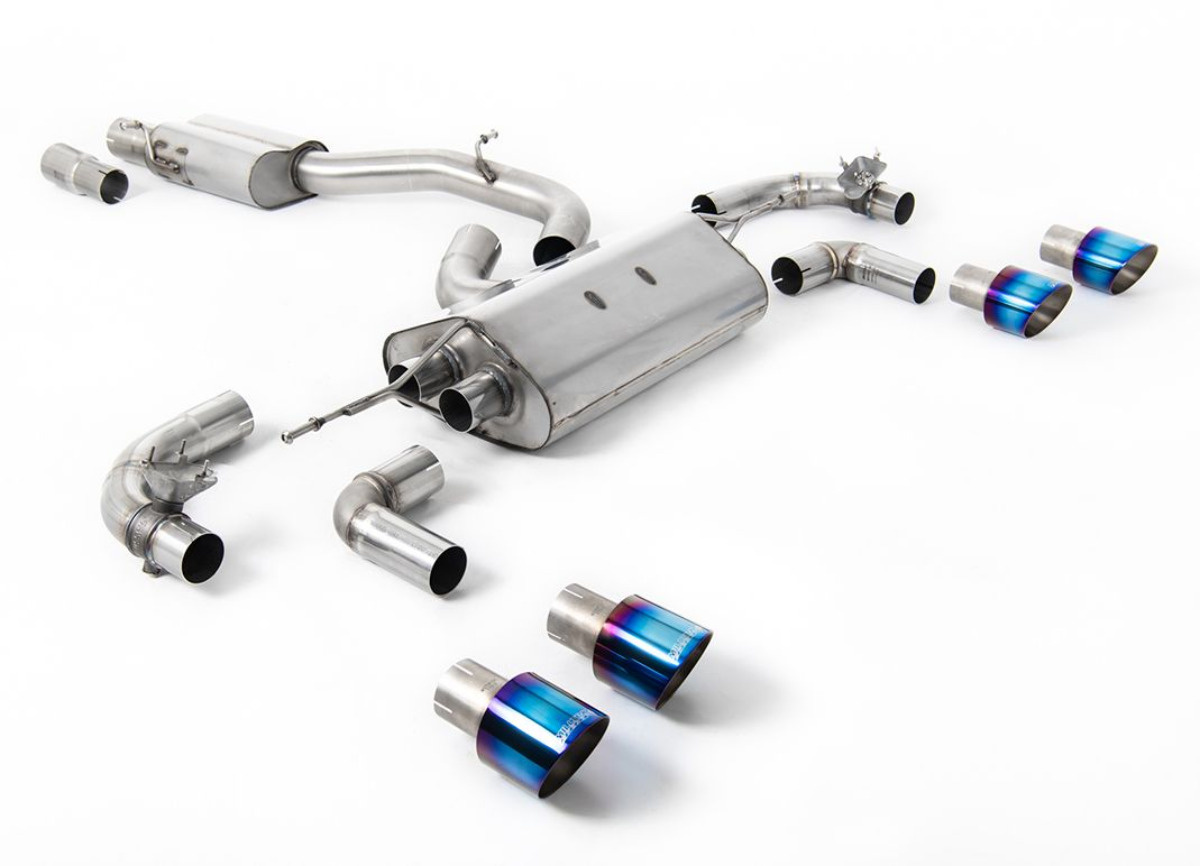 Milltek Sport výfukový systém cat-back 80mm / 3.15" Race s klapkami - s rezonátorem pro Volkswagen Golf Mk7.5 R 2.0 TSI 300PS (s GPF) - 80mm Race Systems 2019-2022, typ koncovek: GT-100 titanové modré