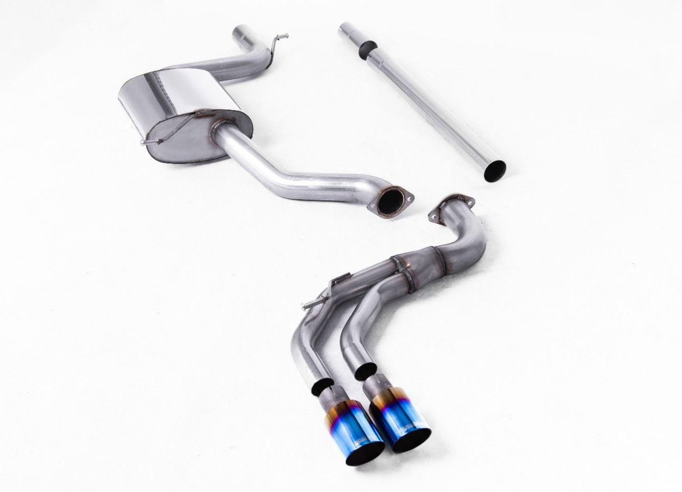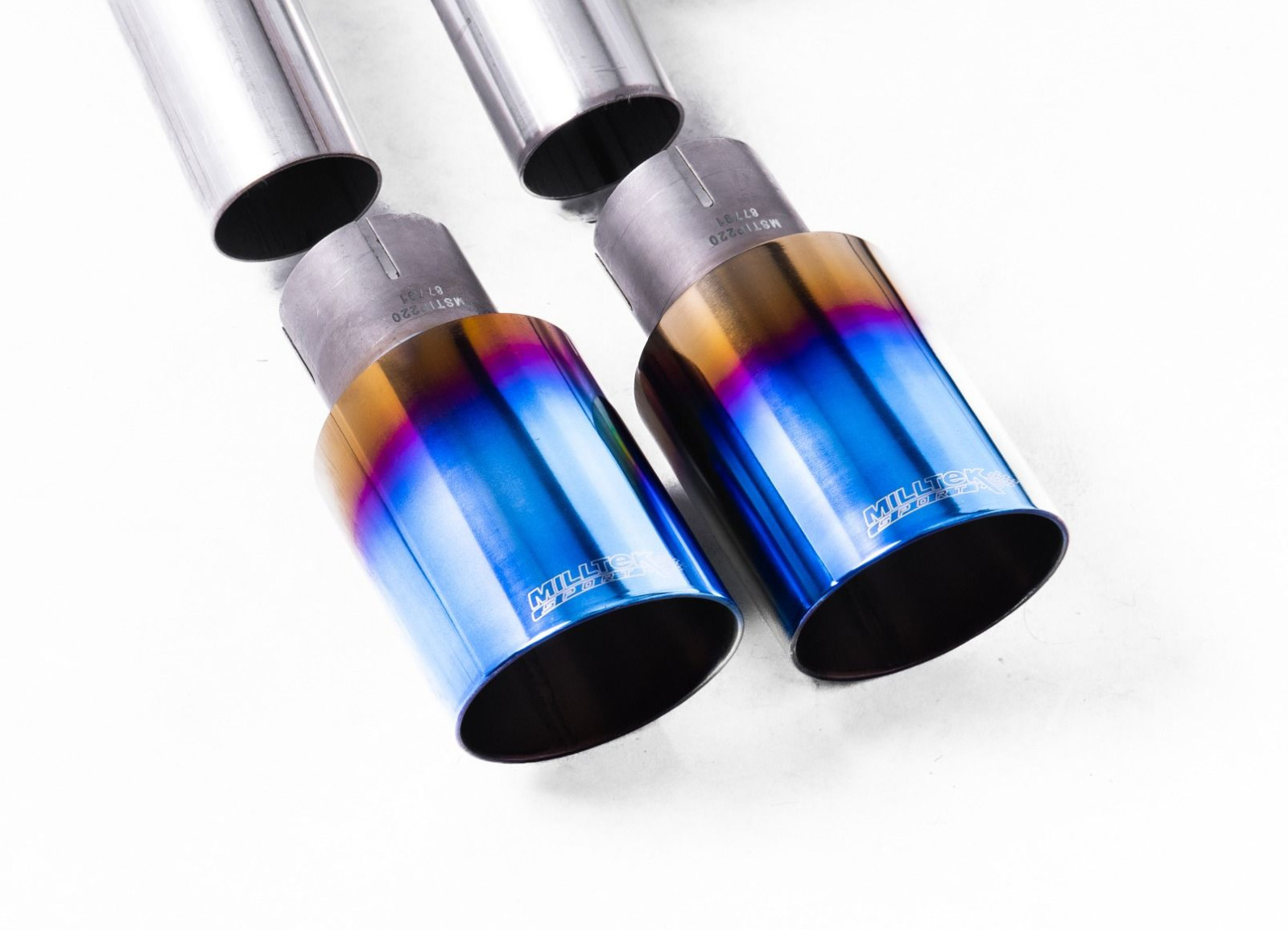 Milltek Sport výfukový systém cat-back bez rezonátoru (hlasitější) GTD Twin Outlet Style pro Volkswagen Golf Mk7.5 1.5TSI Evo GT, R-Line (s i bez GPF/OPF) 2017-2021, typ koncovek: GT-80 titanové modré