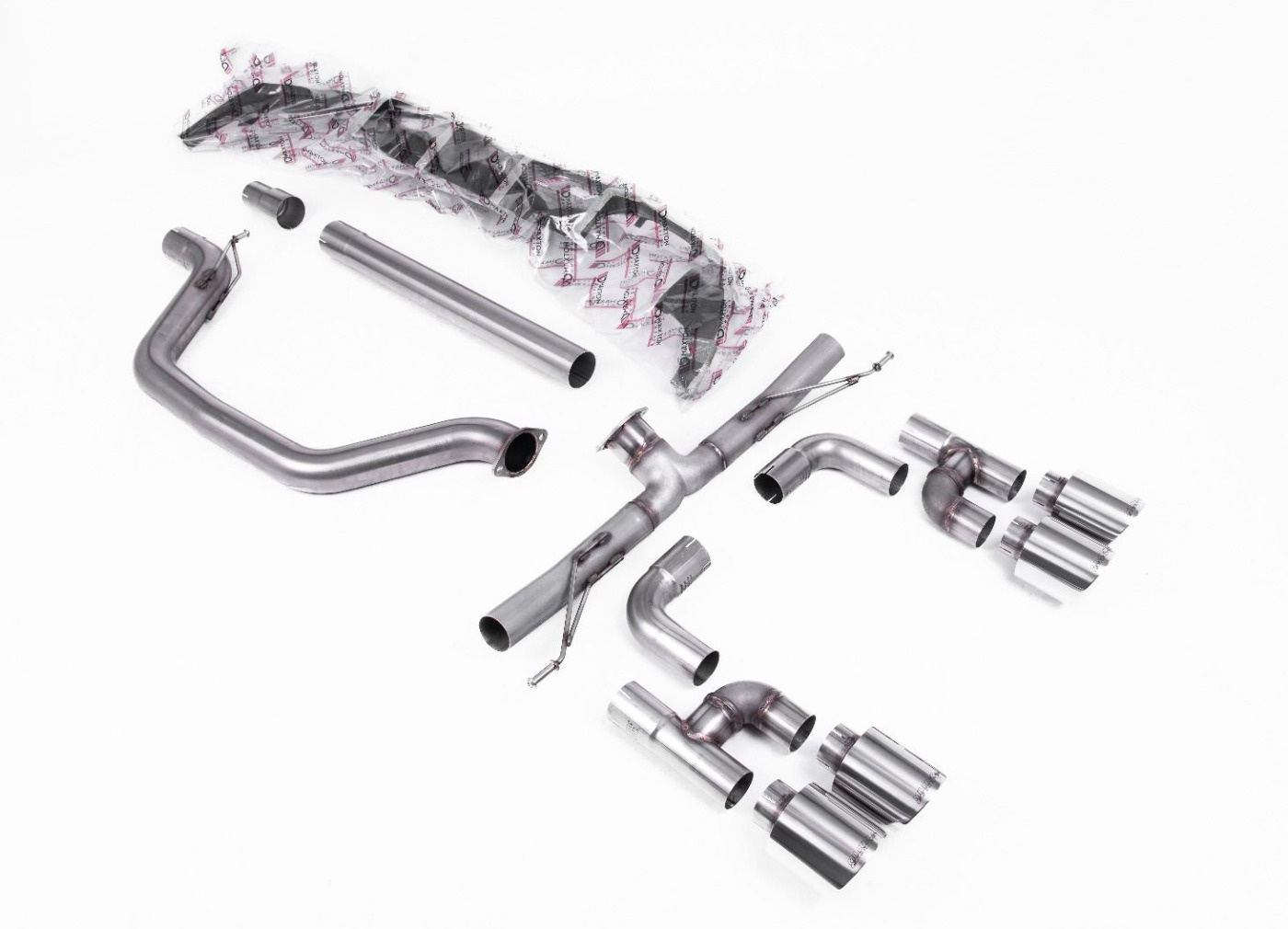 Milltek Sport výfukový systém cat-back Golf R Style - Race (nejhlasitější) pro Volkswagen Golf Mk8 GTi (Golf R Style Quad Outlet Systems - 245ps bez GPF / North American modely) 2021-2024, typ koncovek: GT-115 leštěné