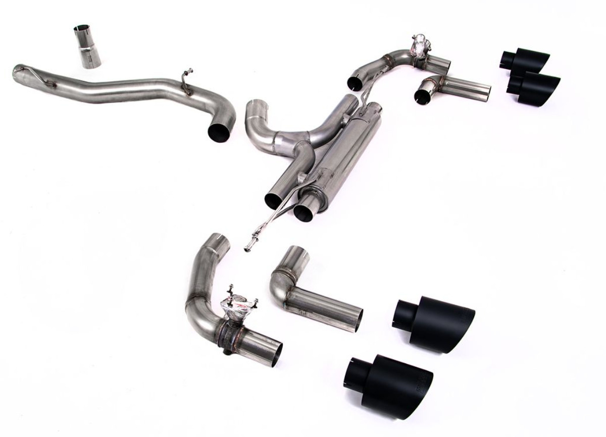 Milltek Sport výfukový systém GPF-Back Race (nejhlasitější) - 80mm / 3.15" pro Volkswagen Golf Mk8 R 2.0 TSI 320PS (s GPF) 2021-2024, typ koncovek: GT-115 černé