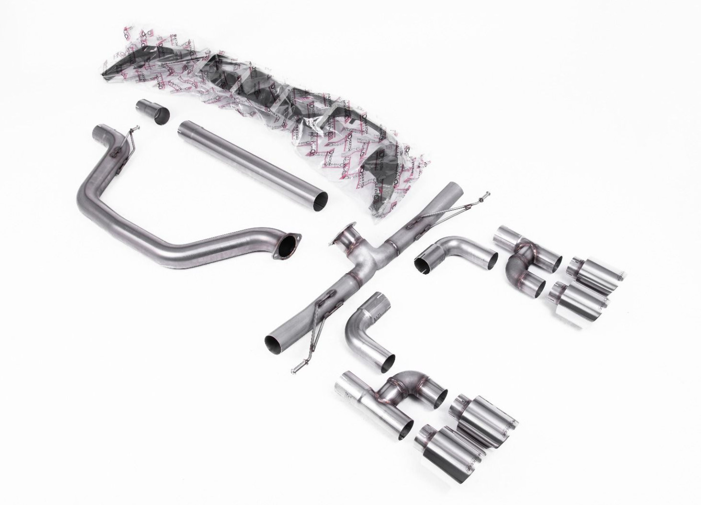 Milltek Sport výfukový systém OPF/GPF Back Golf R Style - Race (nejhlasitější) pro Volkswagen Golf Mk8 GTi (Golf R Style Quad Outlet - 245ps s OPF/GPF) 2020-2024, typ koncovek: GT-115 leštěné