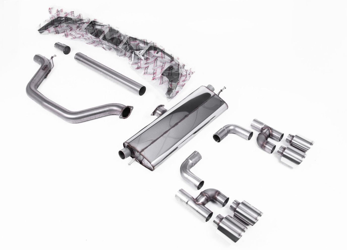 Milltek Sport výfukový systém OPF/GPF Back Golf R Style - Road+ pro Volkswagen Golf Mk8 GTi (Golf R Style Quad Outlet - 245ps s OPF/GPF) 2020-2024, typ koncovek: GT-115 leštěné