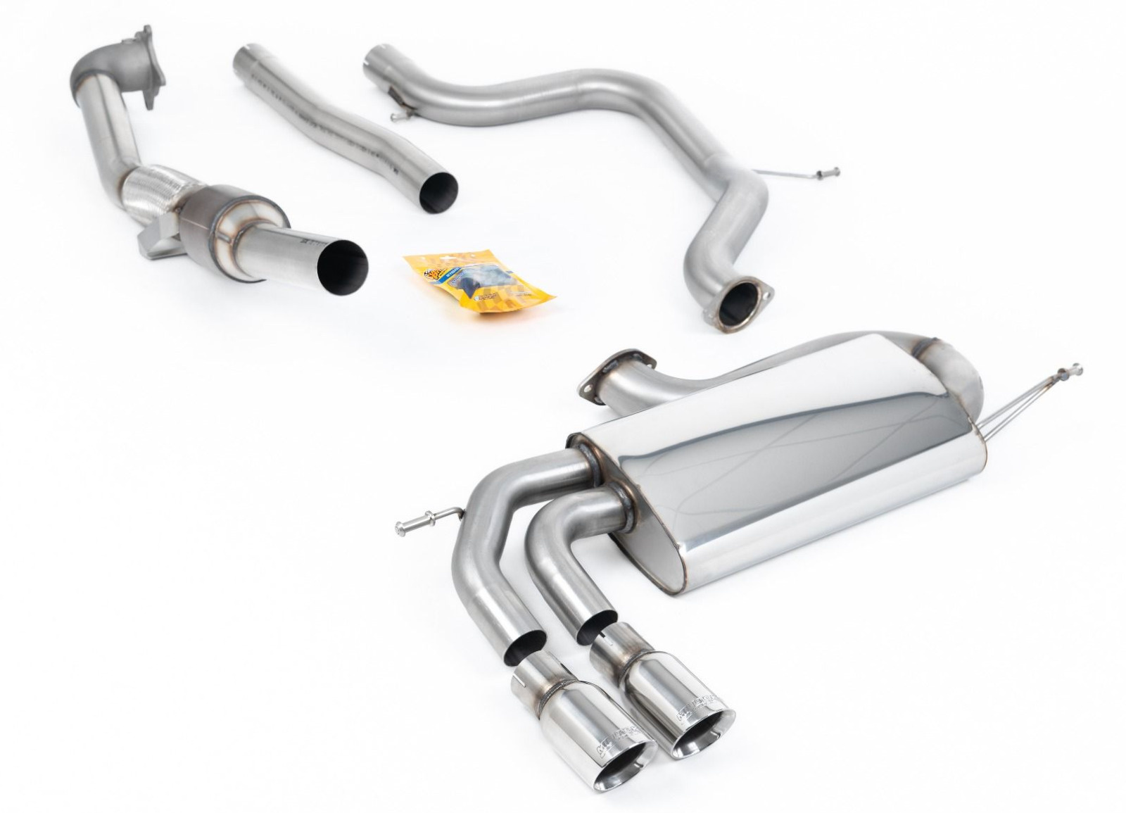 Miltek Sport Turbo-back 3" race System včetně Hi-Flow sportovního katalyzátoru. Bez rezonátoru (hlasitější) pro Volkswagen Golf Mk5 GTi Edition 30 2.0T FSi 230PS, r.v. 2006–2009, leštěné koncovky.