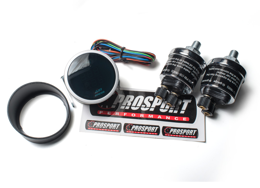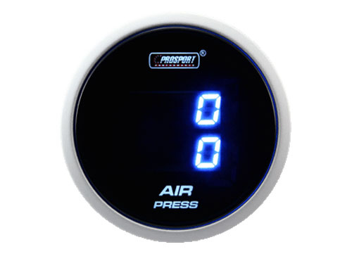 PROSPORT duální ukazatel tlaku vzduchu s modrým podsvícením. Pomocí 2ks elektronických čidel (součástí balení) umožňuje měření tlaku vzduchu na dvou místech soustavy. Navíc není třeba tahat hadičku až k budíku, ale vše je řešeno elektronicky pomocí kabelu.