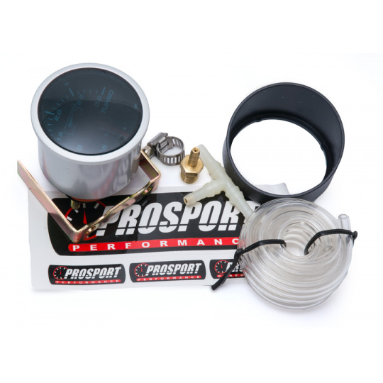 Přídavný mechanický ukazatel tlaku turba Prosport Performance s rozsahem 0 až 3 bar ze série Smoke Lens vhodný pro dieselové motory. Budík má černý podklad podsvícený bílou diodou s červenou ručičkou.