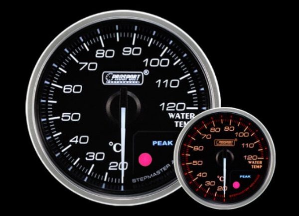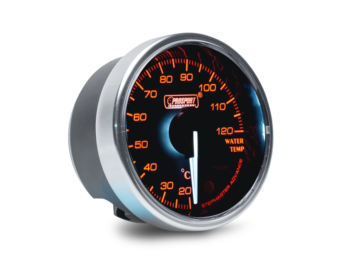 Přídavný ukazatel teploty chladicí kapaliny Prosport Performance - elektronický s jemnou 270° stupnicí s měřeným rozsahem 20 až 120°C ze série Supreme Series. Ukazatel je vybaven moderním krokovým motorkem Stepmaster Advance, který zaručuje maximální přesnost. Zároveň umožňuje nastavit Peak hodnotu, při jejímž dosažení se ukazatel zbarví do červena, rozsvítí varovnou diodu a ozve se zvukový signál.