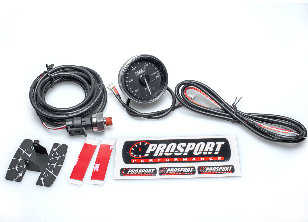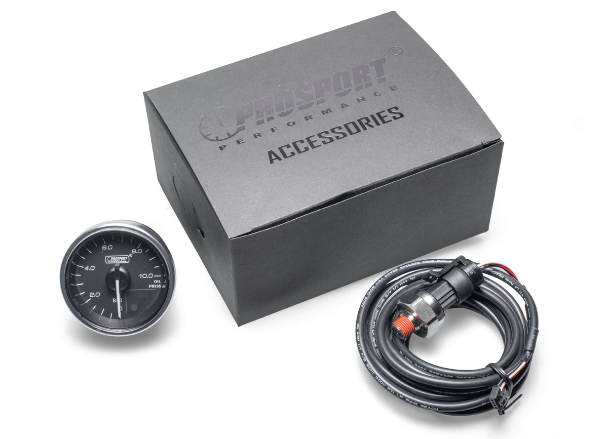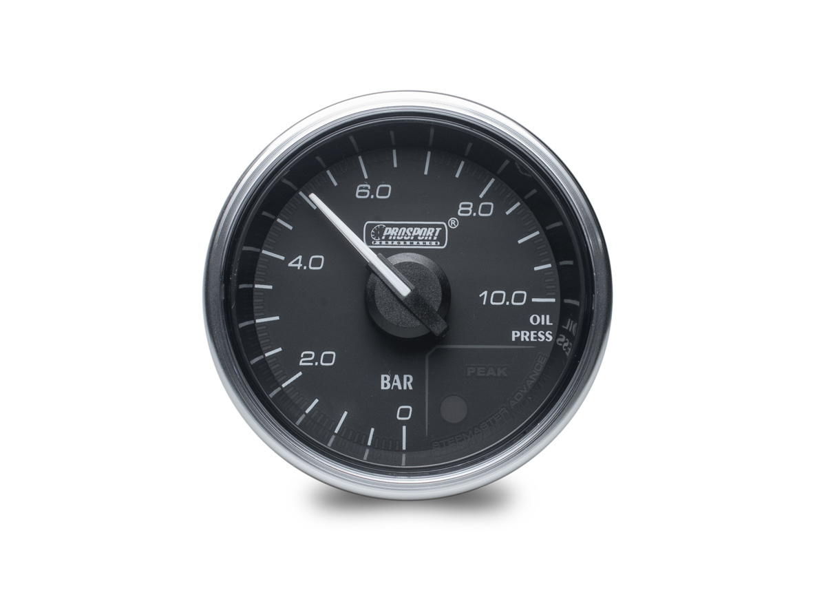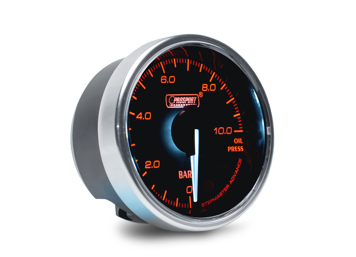 Přídavný ukazatel tlaku oleje Prosport Performance - elektronický s jemnou 270° stupnicí s měřeným rozsahem 0 až 10 bar ze série Supreme Series. Ukazatel je vybaven moderním krokovým motorkem Stepmaster Advance, který zaručuje maximální přesnost. Zároveň umožňuje nastavit Peak hodnotu, při jejímž dosažení se ukazatel zbarví do červena, rozsvítí varovnou diodu a ozve se zvukový signál.