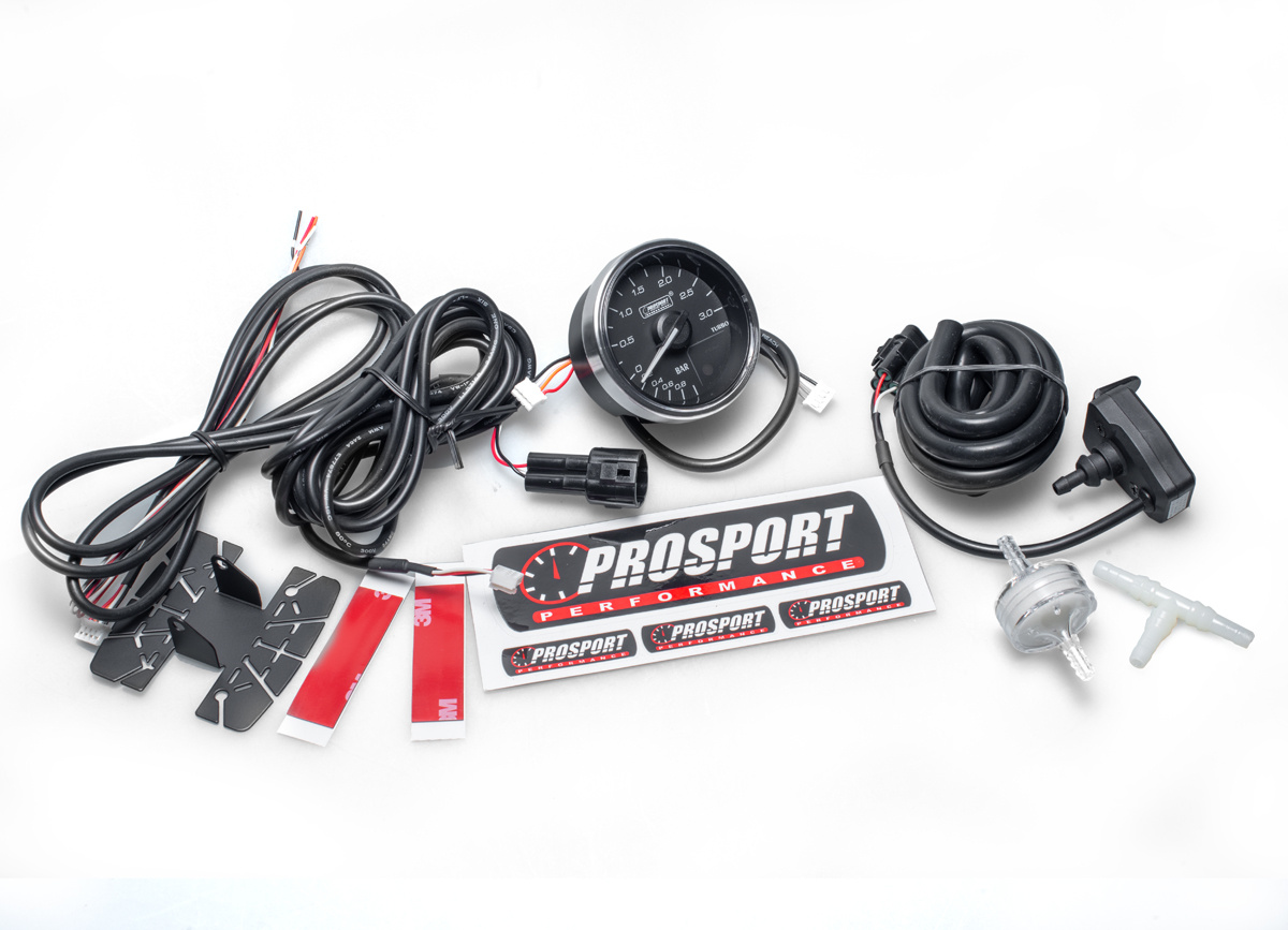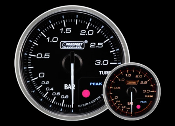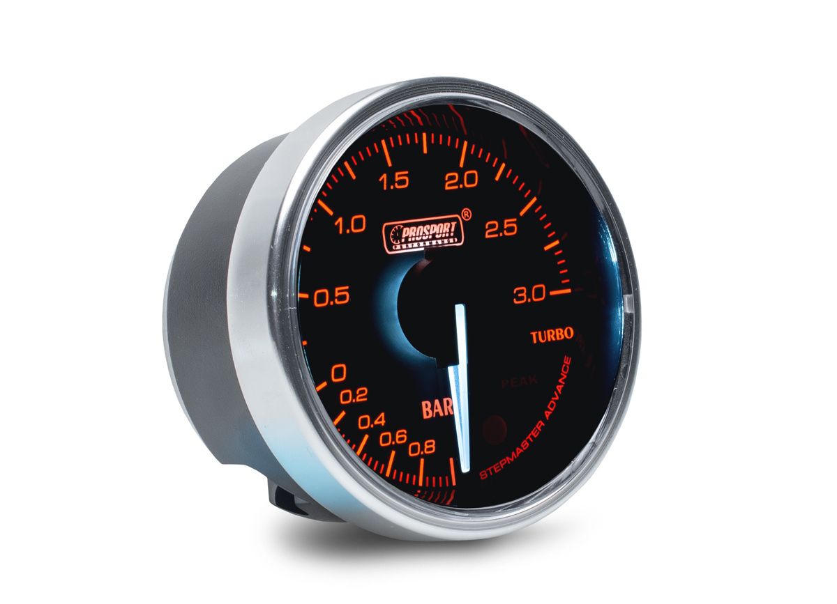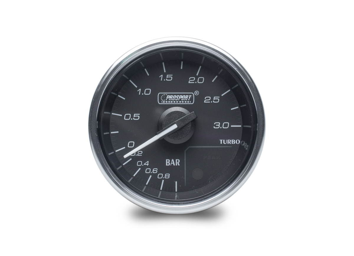 Přídavný ukazatel tlaku turba Prosport Performance - elektronický s jemnou 270° stupnicí s měřeným rozsahem -1 až +3 bar ze série Supreme Series. Ukazatel je vybaven moderním krokovým motorkem Stepmaster Advance, který zaručuje maximální přesnost. Zároveň umožňuje nastavit Peak hodnotu, při jejímž dosažení se ukazatel zbarví do červena, rozsvítí varovnou diodu a ozve se zvukový signál.