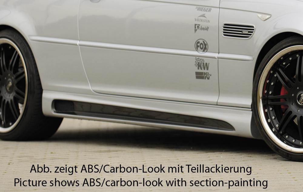 Rieger boční práh mont. strana levá pro BMW řada 3 E46, E46 M3 compact, kabriolet, kupé, sedan vč. faceliftu, r.v. 02/02-, 02/98-12/01, 06/00-, plast ABS s povrchovou úpravou Carbon-Look, s prolisem a výřezem
