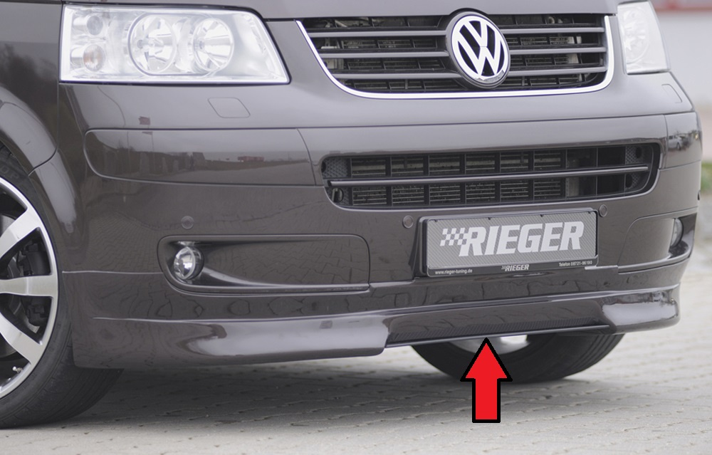 Lipa Rieger Tuning určená pro Volkswagen T5 Bus před faceliftem (04/2003–08/2009). Vyrobena z plastu ABS s povrchovou úpravou Carbon-Look. Montáž pod přední spoiler Rieger – obj. kód Y 00059250.