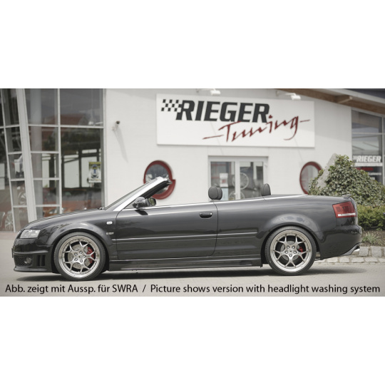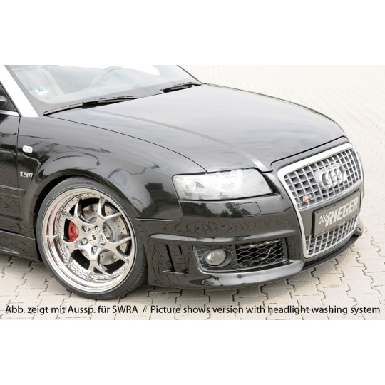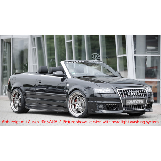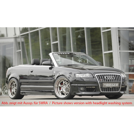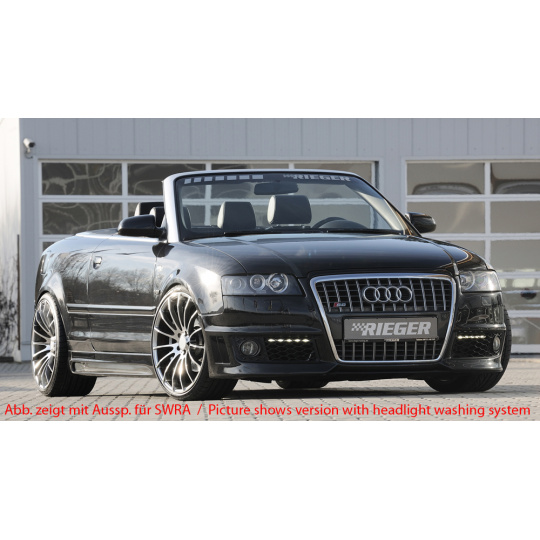 Přední nárazník značky Rieger Tuning určený pro model Audi A4 (Typ 8H) ve verzi kabriolet před faceliftem (04/2002–12/2005). Vyroben z kvalitního plastu ABS bez povrchové úpravy, připraveného k lakování. Díl zaručuje přesné spasování a výrazně podtrhuje sportovní vzhled vozu.