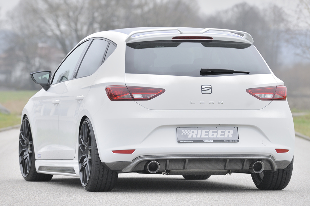 Rieger spoiler pod zadní nárazník pro Seat Leon 5F 3-dvéř. (sc), 5-dvéř. před faceliftem r.v. 10/12-12/16, plast ABS s povrchovou úpravou Carbon-Look, pro sportovní koncovky na obou stranách 100 mm