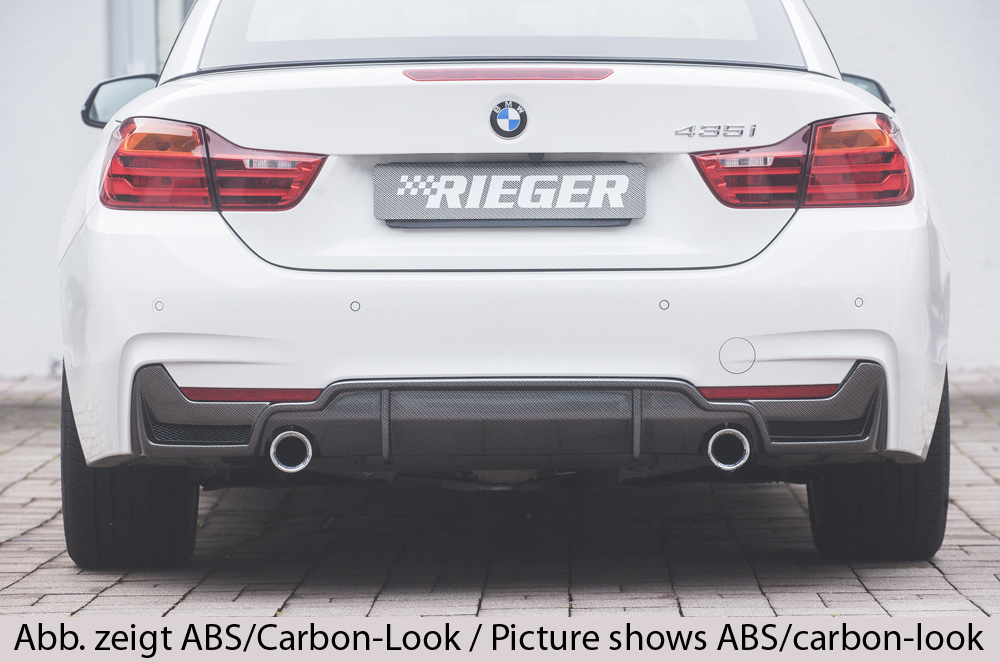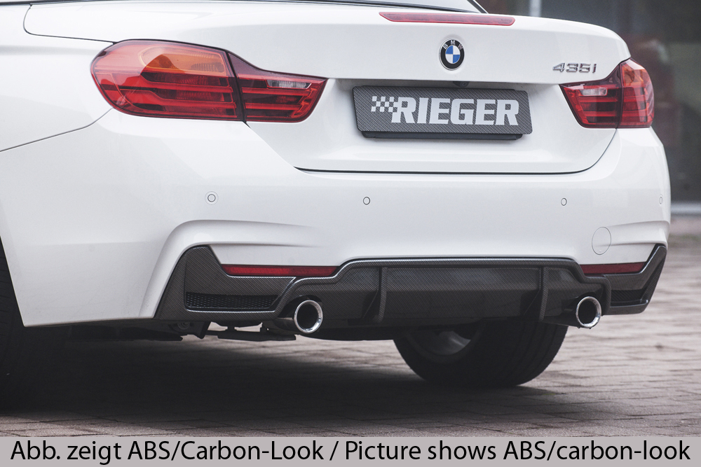 Rieger vložka zadního nárazníku (pouze 435i) pro BMW řada 4 F32, F33, F36 coupe (3-dvéř.), gran coupe (5-dvéř.), kabriolet vč. faceliftu, plast ABS lakovaný do černé lesklé barvy, pro orig. koncovky na obou stranách (435i/440i look) vč. mřížky