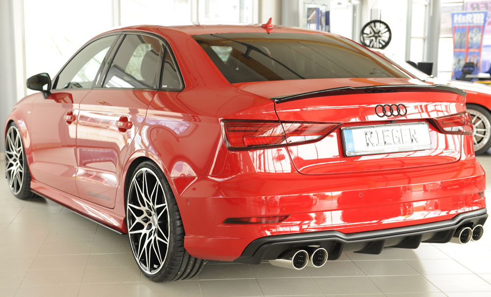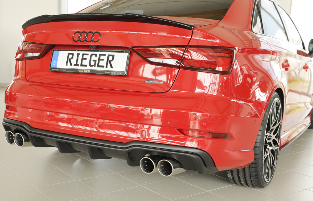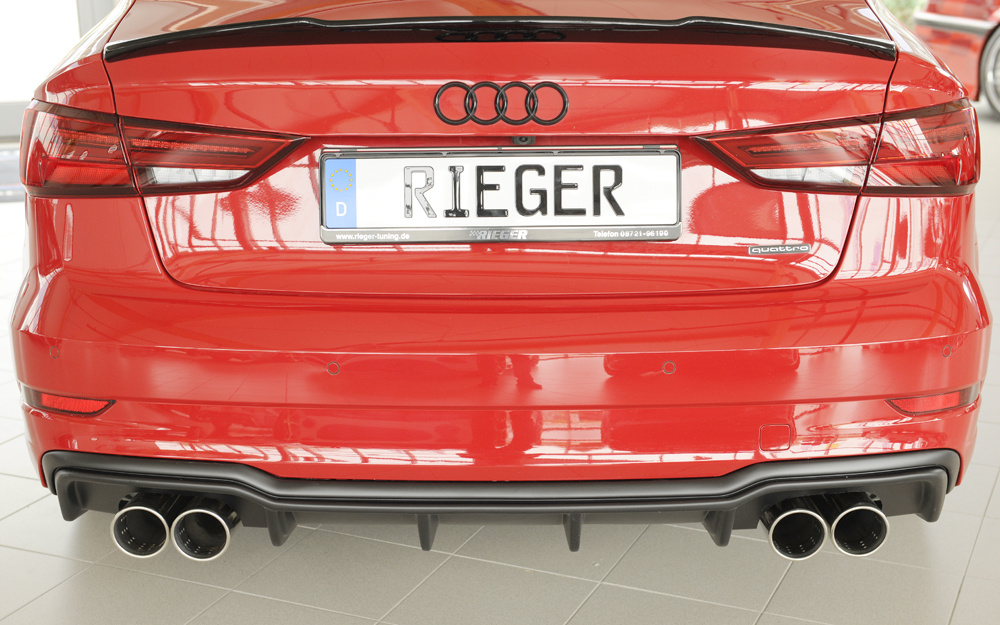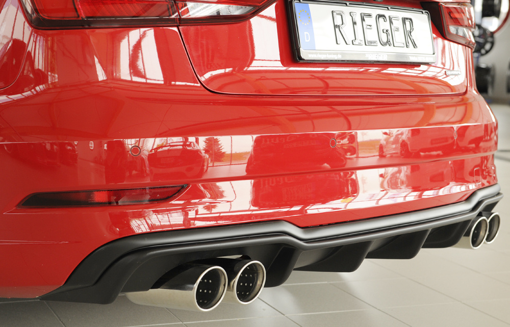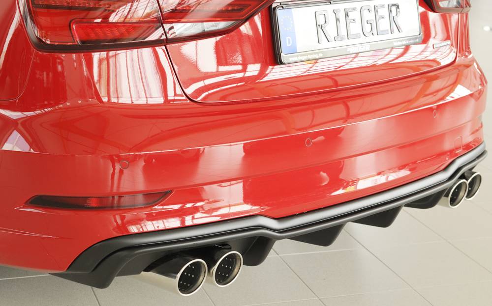 Rieger vložka zadního nárazníku pro Audi A3 8V 3-dvéř. (convertible 8V7), 5-dvéř. (sedan 8VS) po faceliftu, plast ABS bez povrchové úpravy, pro sportovní koncovky na obou stranách 4x90 mm