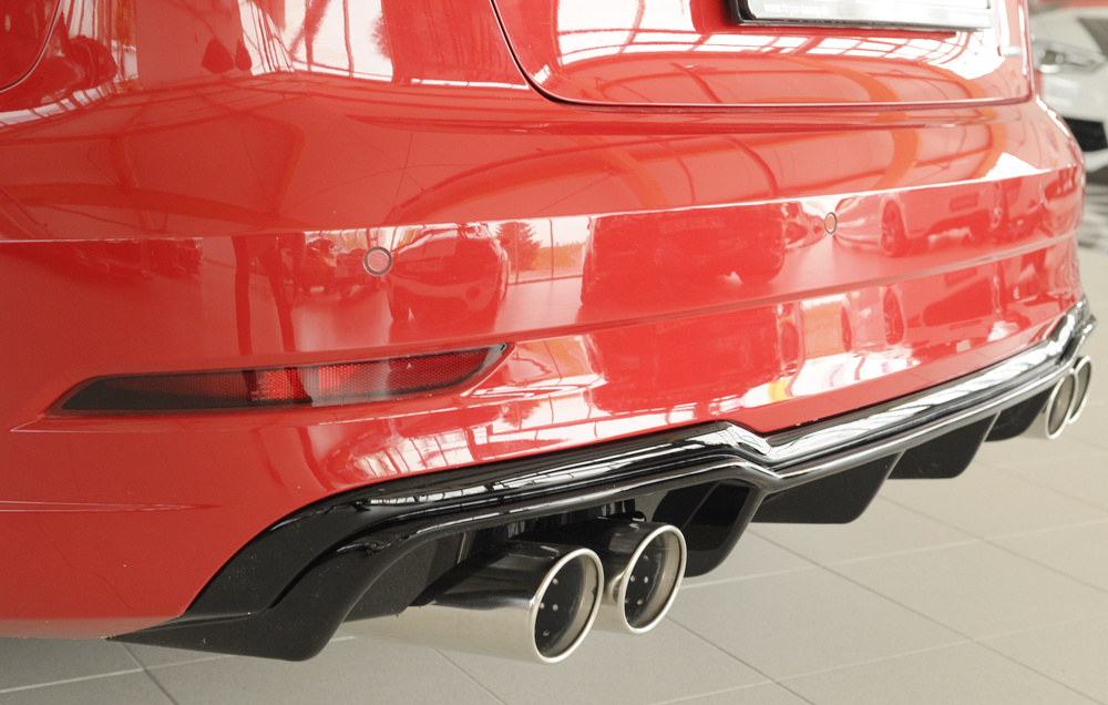 Rieger vložka zadního nárazníku pro Audi A3 8V 3-dvéř. (convertible 8V7), 5-dvéř. (sedan 8VS) po faceliftu, plast ABS lakovaný do černé lesklé barvy, pro sportovní koncovky na obou stranách 4x90 mm