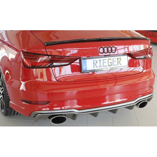 Vložka zadního nárazníku Rieger Tuning určená pro Audi A3 Typ 8V po faceliftu, karoserie Cabriolet (8V7) a Sedan (8VS), roky od 09/16. Vyrobena z ABS plastu s povrchovou úpravou Carbon-Look. Balení obsahuje montážní materiál.