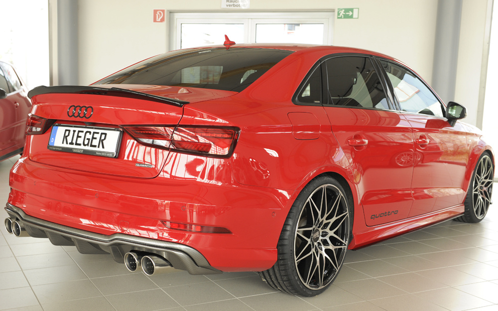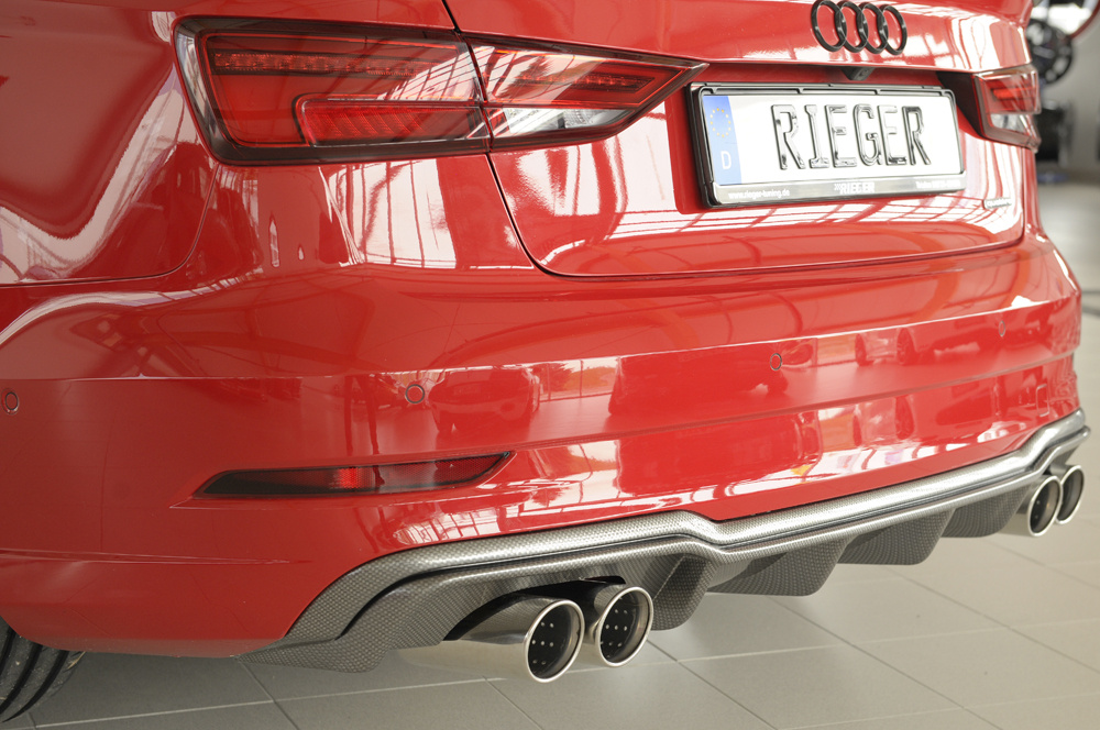 Rieger vložka zadního nárazníku pro Audi A3 8V 3-dvéř. (convertible 8V7), 5-dvéř. (sedan 8VS) po faceliftu, plast ABS s povrchovou úpravou Carbon-Look, pro sportovní koncovky na obou stranách 4x90 mm