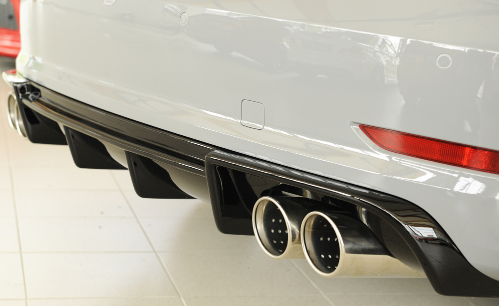Rieger vložka zadního nárazníku pro Audi A3 8V 3-dvéř. (convertible 8V7), 5-dvéř. (sedan 8VS) před faceliftem, plast ABS lakovaný do černé lesklé barvy, pro dvojité koncovky na obou stranách 4x90 mm