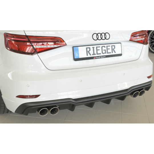 Vložka zadního nárazníku Rieger Tuning určená pro Audi A3 Typ 8V po faceliftu, karoserie 3-dv. hatchback (8V1) a 5-dv. Sportback (8VA), roky od 09/16. Vyrobena z ABS plastu bez povrchové úpravy. Balení obsahuje montážní materiál.