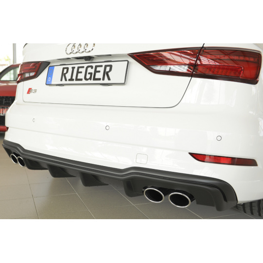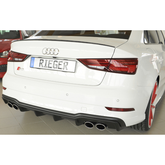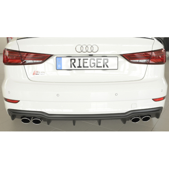 Vložka zadního nárazníku Rieger Tuning určená pro Audi A3 S3 Typ 8V po faceliftu, karoserie 3-dv. Cabriolet (8V7) a 5-dv. Sedan (8VS), roky od 09/16. Vyrobena z ABS plastu bez povrchové úpravy. Balení obsahuje montážní materiál.
