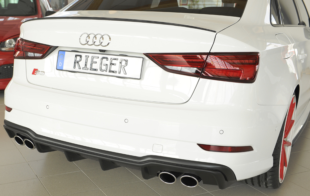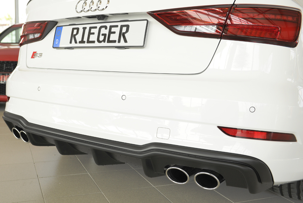 Vložka zadního nárazníku Rieger Tuning určená pro Audi A3 S3 Typ 8V po faceliftu, karoserie 3-dv. Cabriolet (8V7) a 5-dv. Sedan (8VS), roky od 09/16. Vyrobena z ABS plastu bez povrchové úpravy. Balení obsahuje montážní materiál.