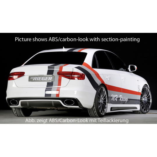 Vložka zadního nárazníku Rieger Tuning určená pro Audi A4 Typ B8, B81 po faceliftu, karoserie Avant i Sedan, roky od 01/12. Vyrobena z ABS plastu s povrchovou úpravou Carbon-Look. Balení obsahuje montážní materiál.
