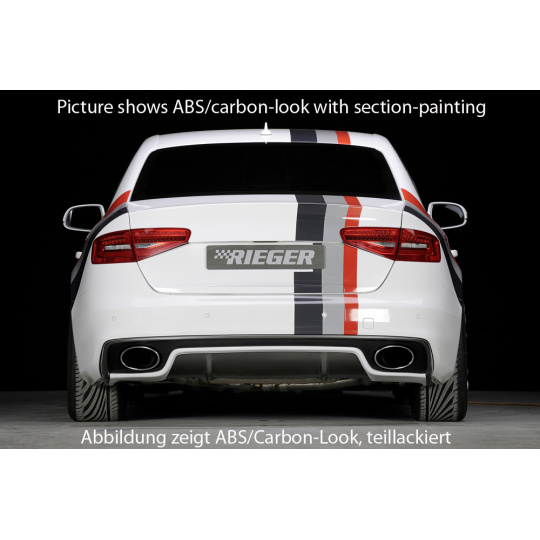 Vložka zadního nárazníku Rieger Tuning určená pro Audi A4 S4 Typ B8, B81 po faceliftu, karoserie Avant i Sedan, roky od 01/12. Vyrobena z ABS plastu lakovaného do černé lesklé barvy (PMMA). Balení obsahuje montážní materiál.