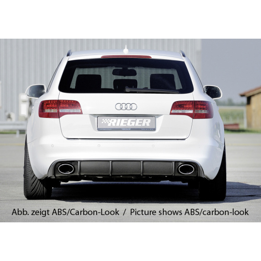 Vložka zadního nárazníku Rieger Tuning určená pro Audi A6 Typ 4F po faceliftu, karoserie Avant a Sedan, roky 10/08–08/11. Vyrobena z ABS plastu lakovaného do černé lesklé barvy. Balení obsahuje montážní materiál.