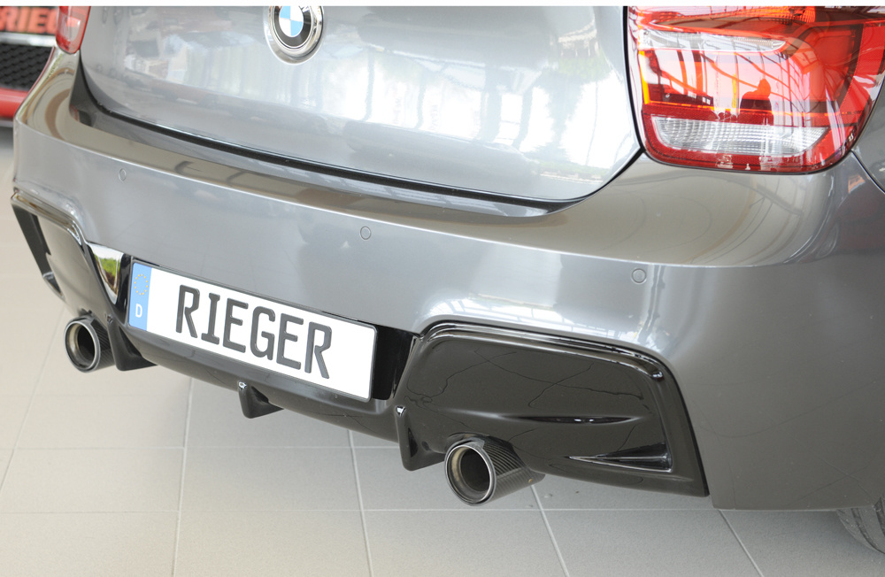 Vložka zadního nárazníku Rieger Tuning určená pro BMW řada 1 Typ F20 / F21 před faceliftem, karoserie sedan / 2-dvéř., sedan / 4-dvéř., modelové roky 09/11–03/2015 (F20) a 09/12–03/2015 (F21). Vyrobena z ABS plastu lakovaného do černé lesklé barvy (PMMA). Součástí balení je montážní materiál.