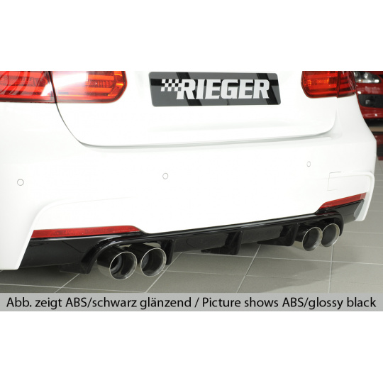 Vložka zadního nárazníku Rieger Tuning určená pro BMW řada 3 Typ F30/F31, karoserie sedan, touring včetně faceliftu. Platí pro vozy 02/12–06/15, 10/12–06/15 a od 07/15. Vyrobena z ABS plastu s povrchovou úpravou Carbon-Look. Součástí balení je montážní materiál.