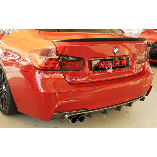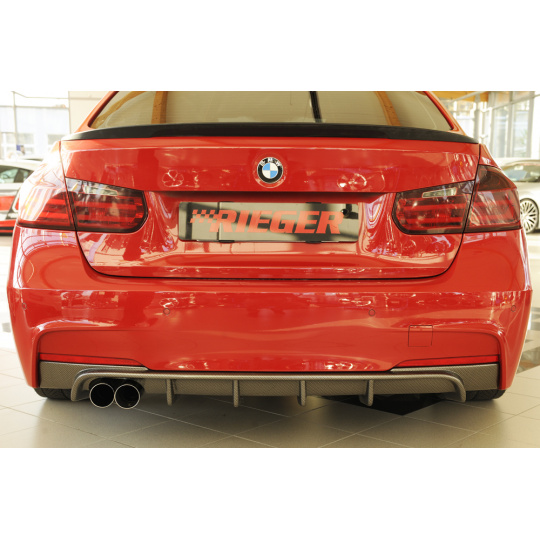 Vložka zadního nárazníku Rieger Tuning určená pro BMW řada 3 Typ F30/F31, karoserie sedan, touring včetně faceliftu. Platí pro vozy 02/12–06/15, 10/12–06/15 a od 07/15. Vyrobena z ABS plastu s povrchovou úpravou Carbon-Look. Součástí balení je montážní materiál.