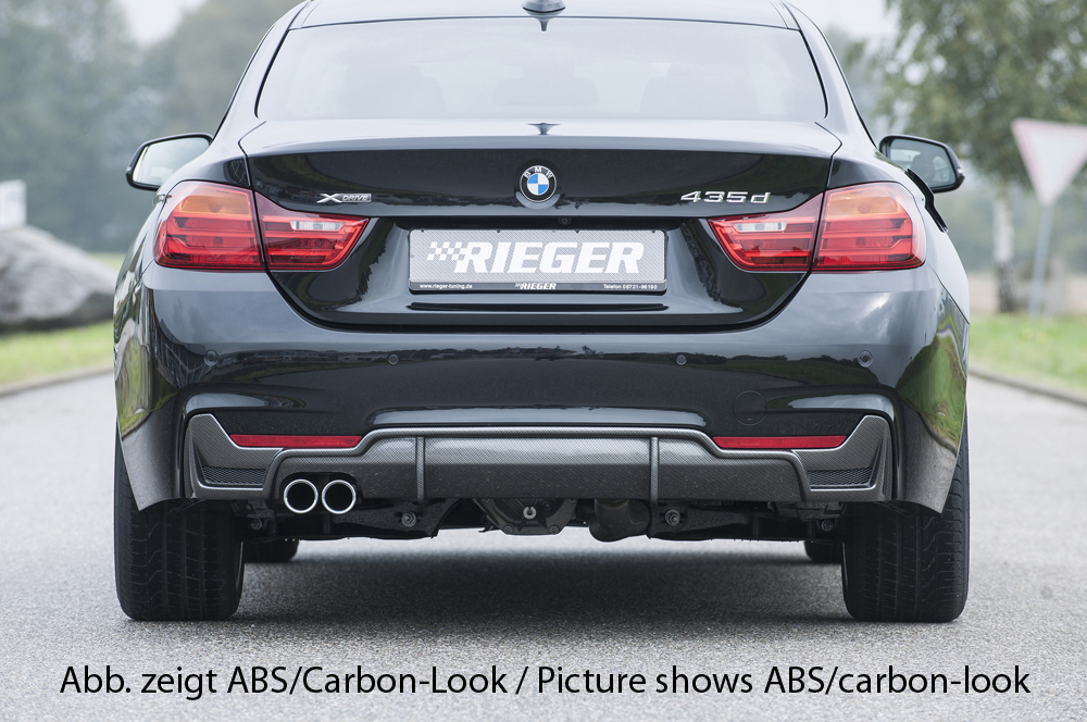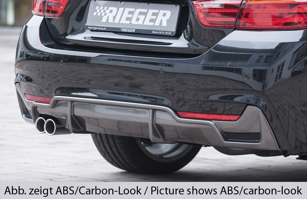 Vložka zadního nárazníku Rieger Tuning určená pro BMW řada 4 Typ F32, F33, F36 včetně faceliftu. Vhodné pro karoserie coupé (3-dv.), Gran Coupé (5-dv.) a kabriolet. Platí pro ročníky 03/2013–06/2015, 05/2014–06/2015, 07/2015– a 11/2012–06/2015. Vyrobena z ABS plastu bez povrchové úpravy. Součástí balení je montážní materiál.