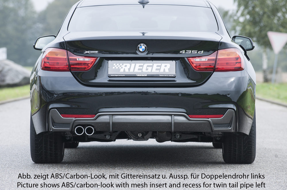Vložka zadního nárazníku Rieger Tuning určená pro BMW řada 4 Typ F32, F33, F36 včetně faceliftu. Vhodné pro karoserie coupé (3-dv.), Gran Coupé (5-dv.) a kabriolet. Platí pro ročníky 03/2013–06/2015, 05/2014–06/2015, 07/2015– a 11/2012–06/2015. Vyrobena z ABS plastu lakovaného do černé lesklé barvy. Součástí balení je montážní materiál.