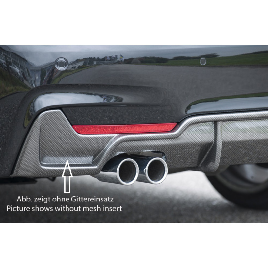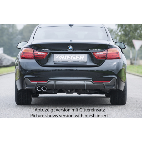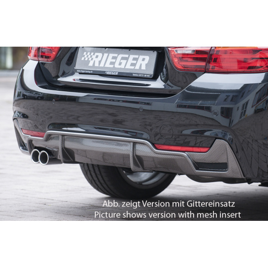 Vložka zadního nárazníku Rieger Tuning v provedení Carbon-Look určená pro BMW řada 4 Typ F32, F33, F36 včetně faceliftu. Vhodné pro karoserie coupé (3-dv.), Gran Coupé (5-dv.) a kabriolet. Platí pro ročníky 03/2013–06/2015, 05/2014–06/2015, 07/2015– a 11/2012–06/2015. Vyrobena z ABS plastu s povrchovou úpravou Carbon-Look. Součástí balení je montážní materiál.
