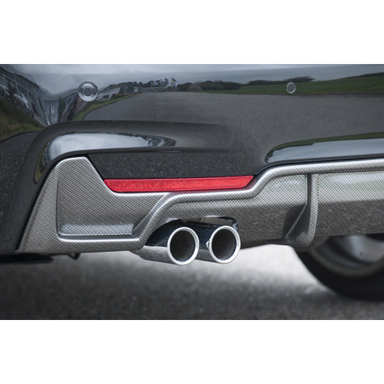 Rieger vložka zadního nárazníku pro BMW řada 4 F32, F33, F36 coupe (3-dvéř.), gran coupe (5-dvéř.), kabriolet vč. faceliftu, plast ABS s povrchovou úpravou Carbon-Look, pro orig. dvojitou koncovku vlevo