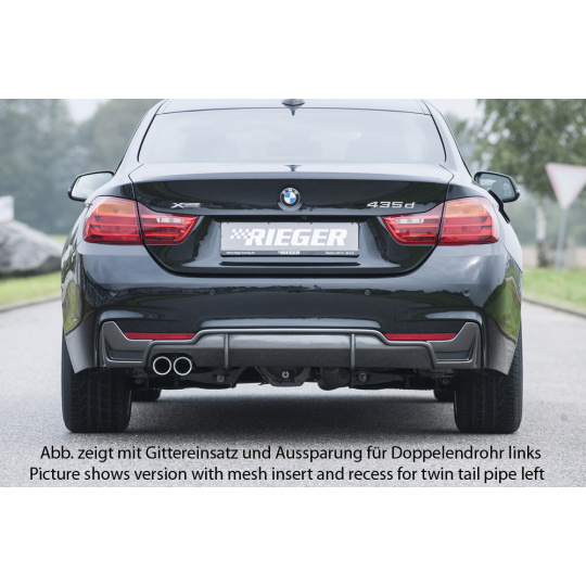 Vložka zadního nárazníku Rieger Tuning v provedení Carbon-Look určená pro BMW řada 4 Typ F32, F33, F36 včetně faceliftu. Vhodné pro karoserie coupé (3-dv.), Gran Coupé (5-dv.) a kabriolet. Platí pro ročníky 03/2013–06/2015, 05/2014–06/2015, 07/2015– a 11/2012–06/2015. Vyrobena z ABS plastu s povrchovou úpravou Carbon-Look. Součástí balení je montážní materiál.