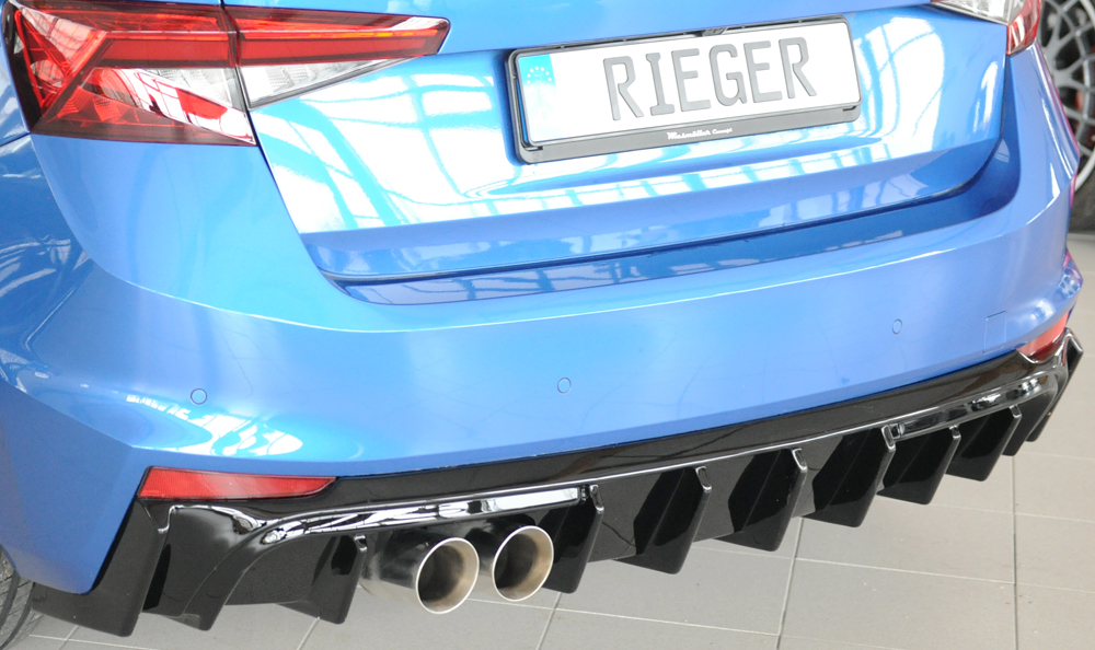 Rieger vložka zadního nárazníku pro orig. koncový tlumič výfuku pro Škoda Fabia PJ hatchback, 06/21-, plast ABS lakovaný do černé lesklé barvy, mont. strana