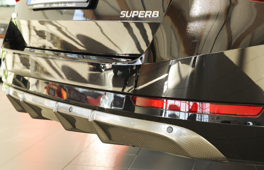 Rieger vložka zadního nárazníku pro Škoda Superb III 3T, 3V combi, sedan vč. faceliftu, plast ABS s povrchovou úpravou Carbon-Look, pro vozy bez tažného zařízení