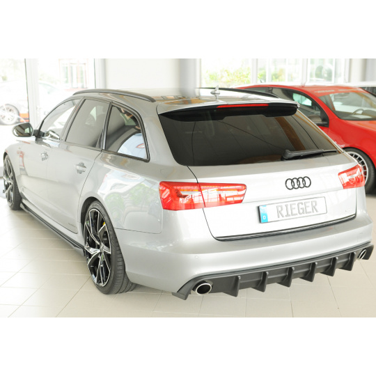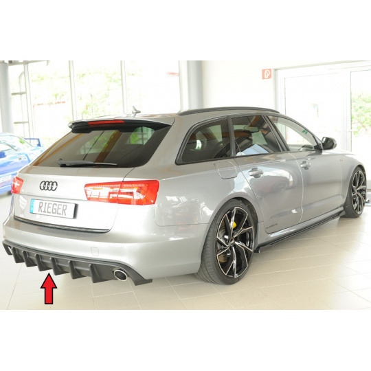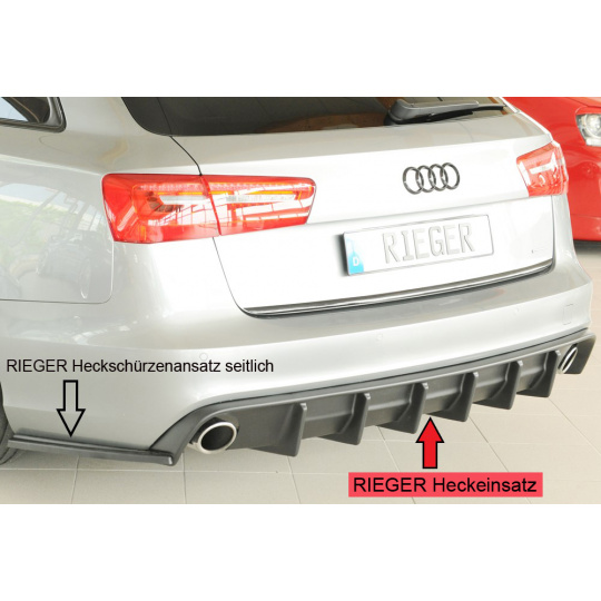 Vložka zadního nárazníku Rieger Tuning určená pro Audi A6 Typ 4G/C7, karoserie sedan, roky 11/10–08/14. Varianta je určena pro vozy s tažným zařízením. Vyrobena z ABS plastu bez povrchové úpravy. Balení obsahuje montážní materiál.