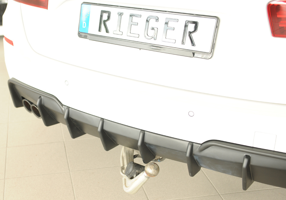 Vložka zadního nárazníku Rieger Tuning určená pro BMW řada 5 Typ F11, karoserie Touring, roky 09/10–06/13. Varianta je určena pro vozy s tažným zařízením. Vyrobena z ABS plastu bez povrchové úpravy. Balení obsahuje montážní materiál.