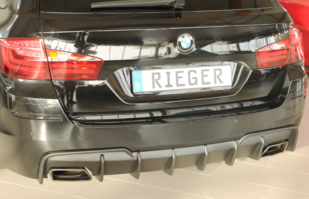 Vložka zadního nárazníku Rieger Tuning určená pro BMW řada 5 Typ F11, karoserie Touring, roky 09/10–06/13. Varianta je určena pro vozy s tažným zařízením. Vyrobena z ABS plastu bez povrchové úpravy. Balení obsahuje montážní materiál.