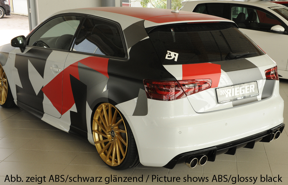 Vložka zadního nárazníku Rieger Tuning Typ 56805 určená pro Audi A3 S3 Typ 8V před faceliftem, karoserie 3-dv. hatchback (8V1) a 5-dv. sportback (8VA), roky 05/13–08/16. Vyrobena z ABS plastu bez povrchové úpravy. Balení obsahuje montážní materiál.