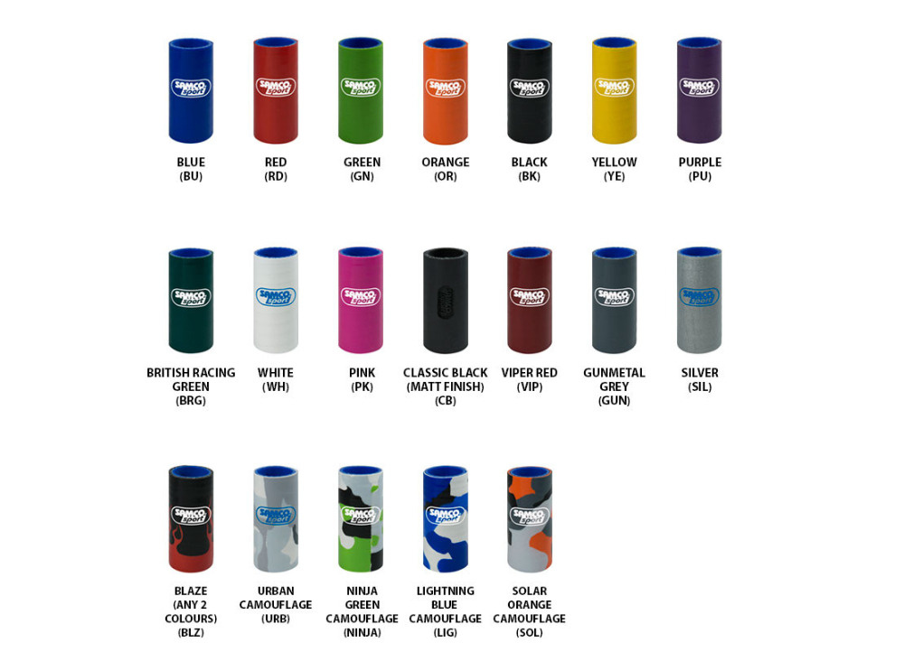 Silikonové hadice Samco Sport je možné objednat v mnoha barevných variantách. Vzhledem k této široké nabídce je většina hadic vyráběna na základě konkrétní objednávky. U položek, které nejsou skladem v dostatečném množství, počítejte s delší dobou dodání.