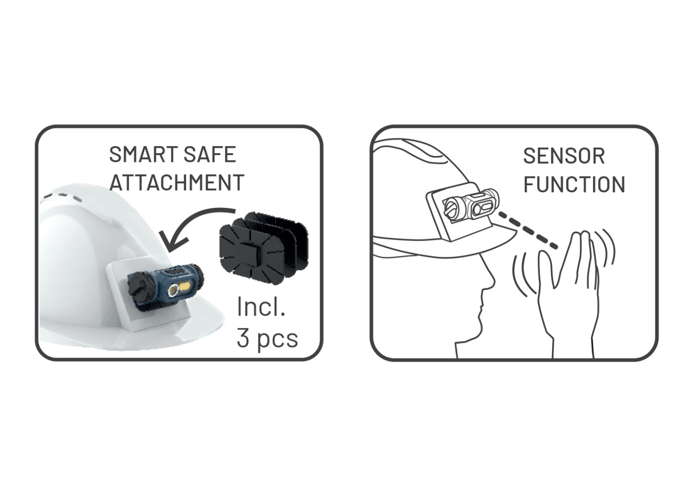 - připevňuje se na bezpečnostní helmu pomocí SMART SAFE ATTACHMENT a přiložených lepicích montážních podložek