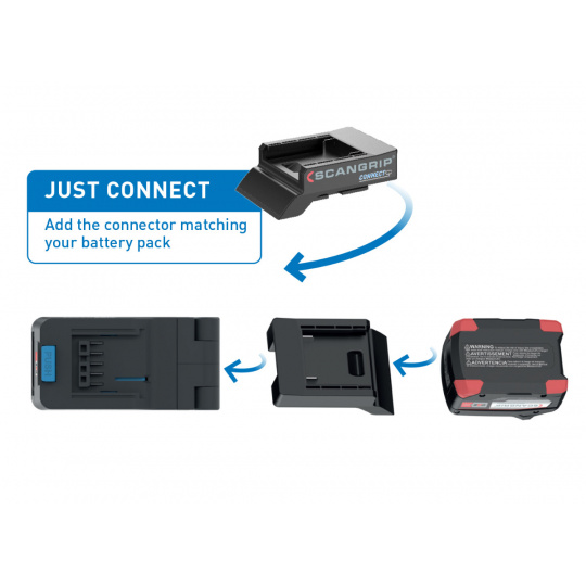 TOWER COMPACT CONNECT je kompatibilní s METABO / CAS bateriovým systémem 18 V a všemi ostatními 18 V/20 V bateriovými sadami předních značek elektrického nářadí pomocí SCANGRIP CONNECTOR. Kromě toho lze adaptér SCANGRIP POWER SUPPLY použít pro přímé napájení poskytující neomezenou dostupnost světla.