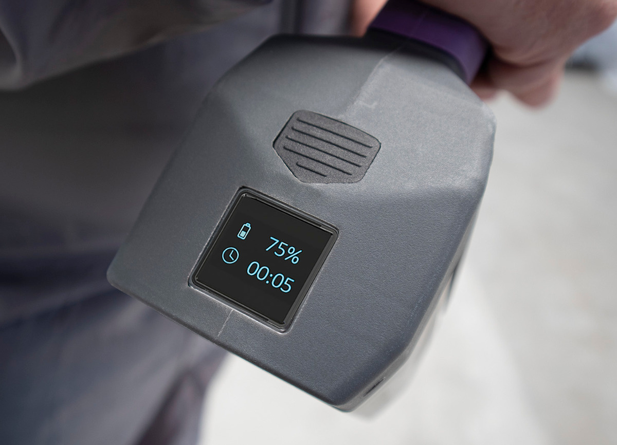 SCANGRIP UV-GUN Výkonné pracovní světlo pro velmi rychlé a efektivní UV vytvrzování velkých oblastí. Napájení pomocí vyměnitelného akumulátoru. Snadno můžete vložit novou plně nabitou baterii a pokračovat v práci, zatímco se nabíjí další baterie. LCD displej vás informuje o stavu baterie a době vytvrzování.