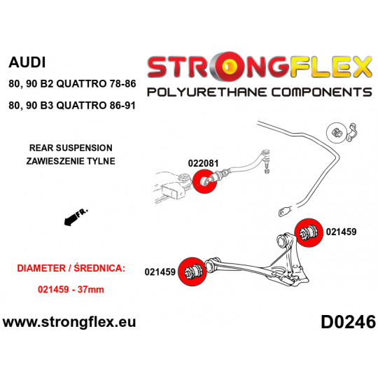 Audi 80 / 90 B3 (86-91) Quattro / S2 Coupe - Tento silentblok je dostupný pouze v tvrdosti 90ShA (žlutá), protože původní gumový silentblok je vyroben z tvrdé gumové směsi. Použití silentbloku s tvrdostí 80ShA (červená) sníží jízdní vlastnosti vozu na úroveň původního gumového silentbloku.