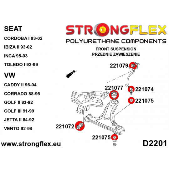 Existují dva typy silentbloků předního ramene, pozdější modely mají větší silentbloky ?45mm (221343), zatímco starší modely byly vybaveny menšími silentbloky ?30mm (221072). Před objednáním si prosím pečlivě zkontrolujte, jaký typ silentbloku máte ve svém voze (viz foto S2201)!